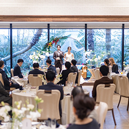 天井高も高く自然光を会場内に取り入れた開放的な空間。 落ち着いた雰囲気の空間ではお二人の選んだ装花やテーブルコーディネートが鮮やかに映えます。